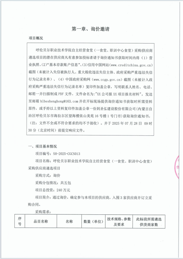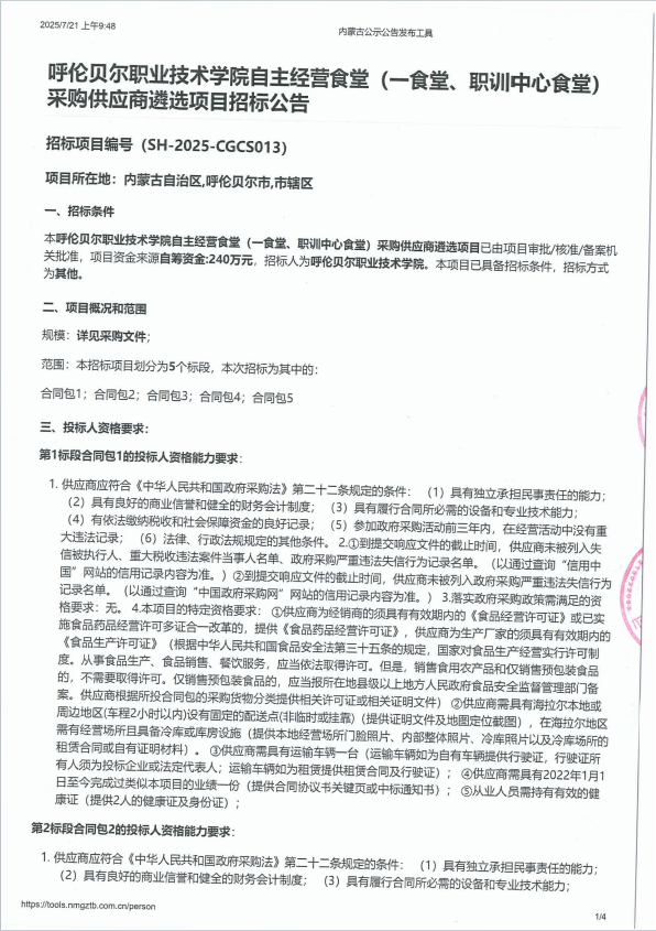 呼伦贝尔职业技术学院自主经营食堂(一食堂、职训中心食堂)采购供应商遴选项目招标公告
